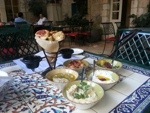 לאחר מכן הגיעו לשולחן סלטים מעולים וטריים בצלוחיות : סלט חומוס גרוס וושמן זית טרי וטעים במיוחד, גבינת לבנה בשמן זית, סלט חצילים על האש ושום, סלט טאבולה עגבניות וכוזברה טרייה וסלט כרובית מטוגנת על מצע סלט עגבניות ובצל סגול מלווה עם קונוס של מאפי הבית קובה ופלאפל מדהים.