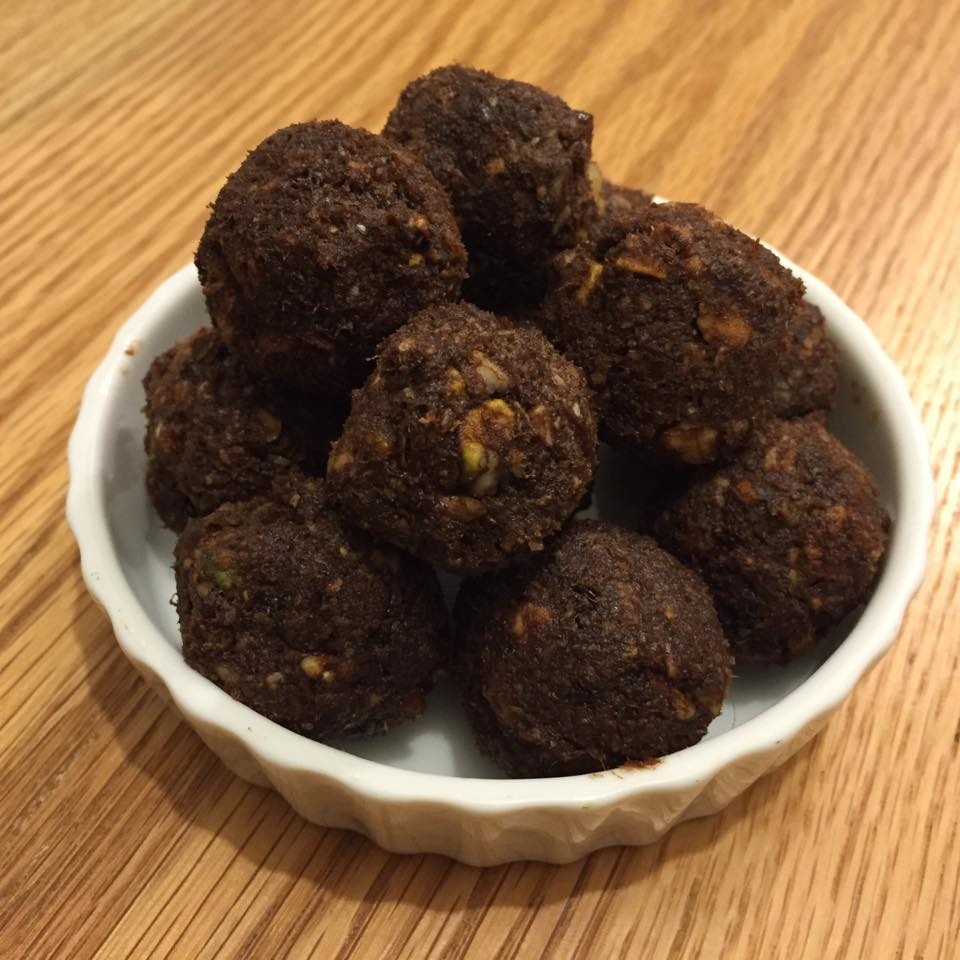 הכנה: לטחון הכל במעבד מזון עד שנוצרת עיסה אחידה. ליצור 20 כדורי שוקולד יפים . לקרר לפחות שעה לפני ההגשה.
