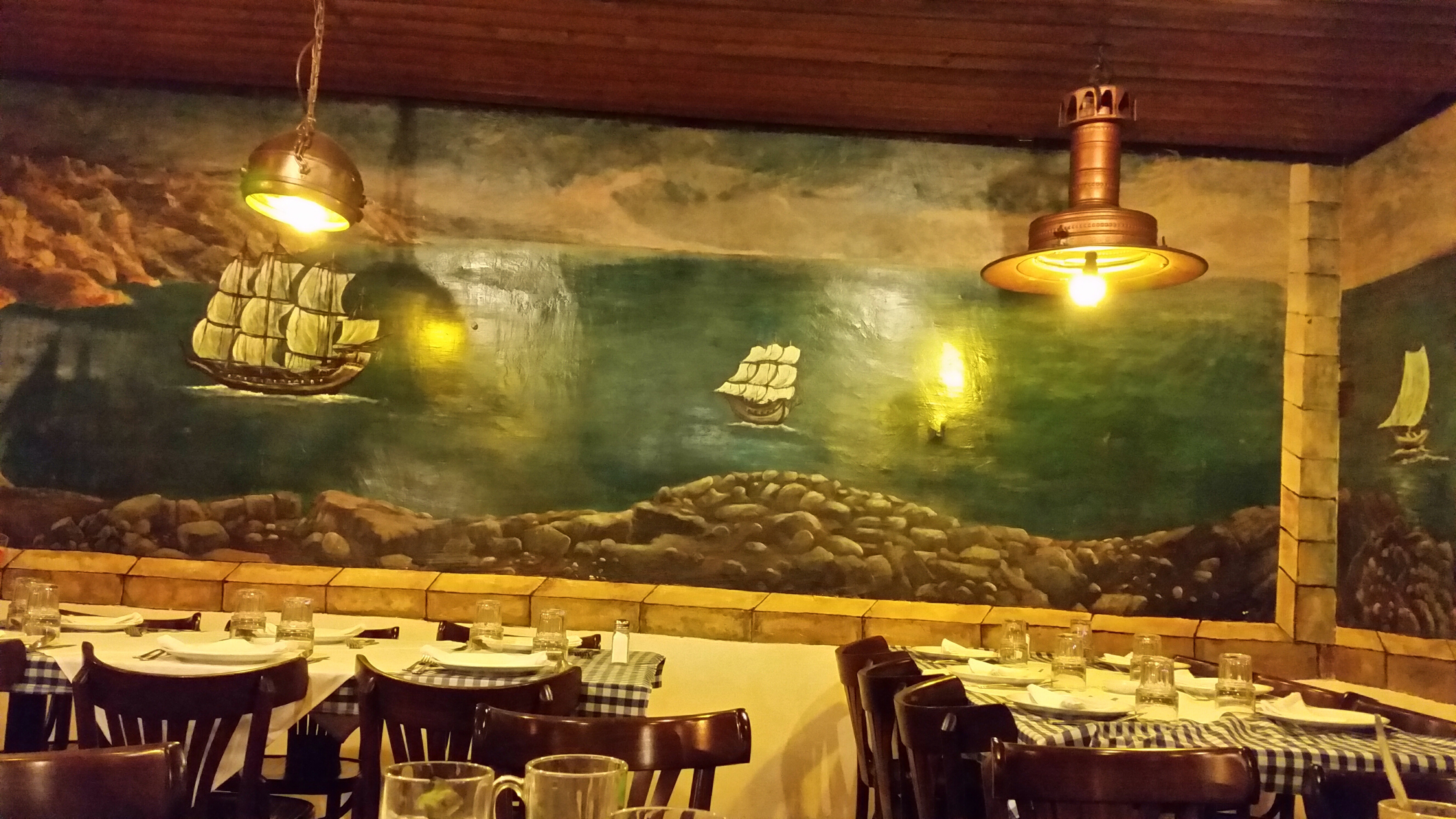 המסעדה מעוצבת ומאובזרת ברשתות דיג, תמונות ועוגנים באלמנטים של מוזאון ימי שמשרים אווירת מלחים קוסמית.
