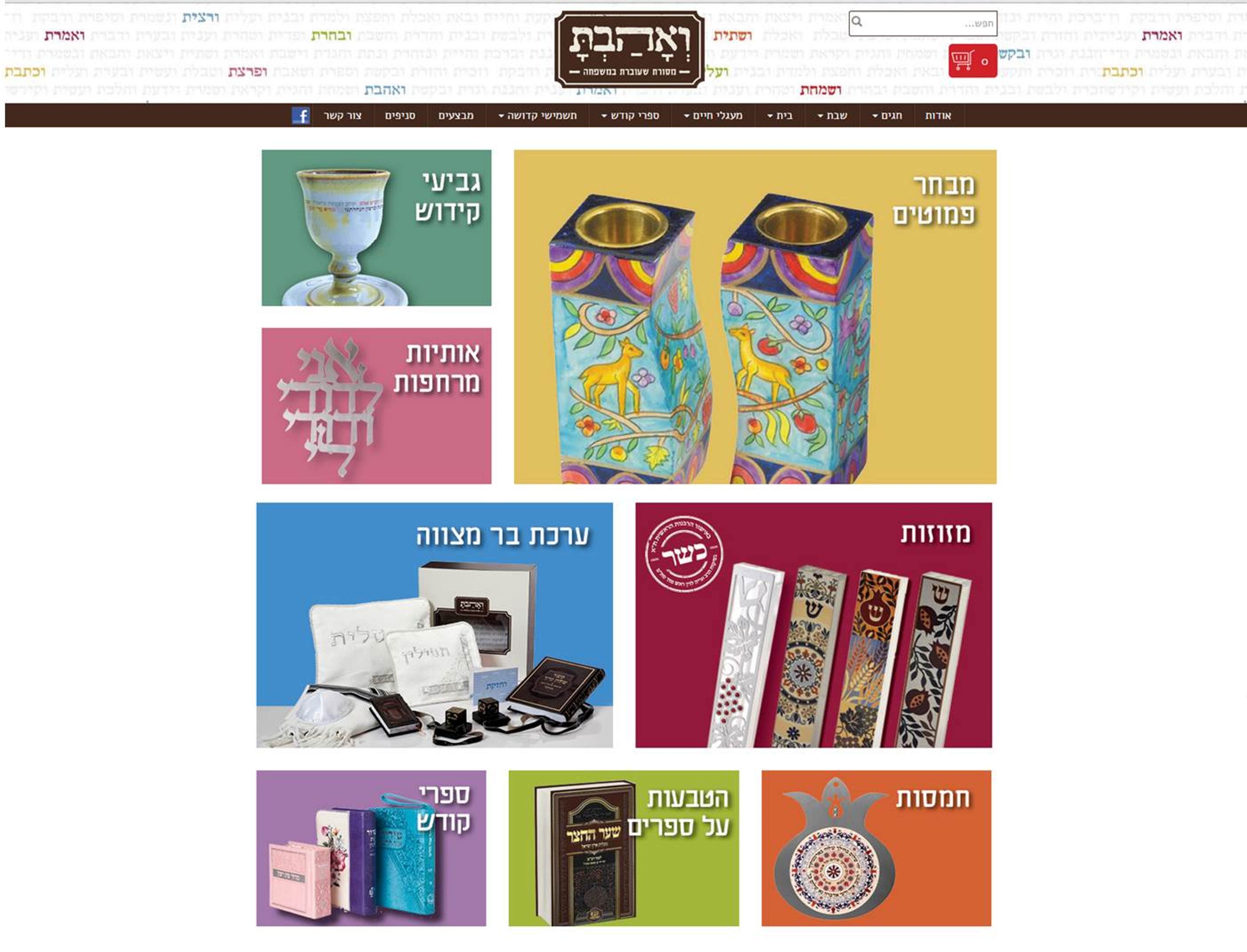 אתר "ואהבת" יציע, חווית קנייה ייחודית ועדכנית ומגוון פריטי קודש ואומנות יהודיים ואיכותיים, במחירים הוגנים ה"ארוזים" בסיפורים ובתכנים מרתקים. האתר כמו חנויות הרשת, יציע תמהיל מוצרים רחב ומגוון, בניהם: אביזרים לעיצוב לבית, אומנות יהודית, ספרים, מוסיקה, מזוזות, טליתות, ערכה מהודרת המכילה פריטים לחתן המצווה, כתובות לחתונה, ספרי הכנה ללידה, כרית לברית, פמוטים, גביעים, הגדות, נטלן ידיים, כיסוי לחלות, קערות ליל סדר, כיסוי לאפיקומן, סביבונים, מגילות אסתר, שופרות, פריטים ייחודיים של יוצרים ואומנים ועוד.