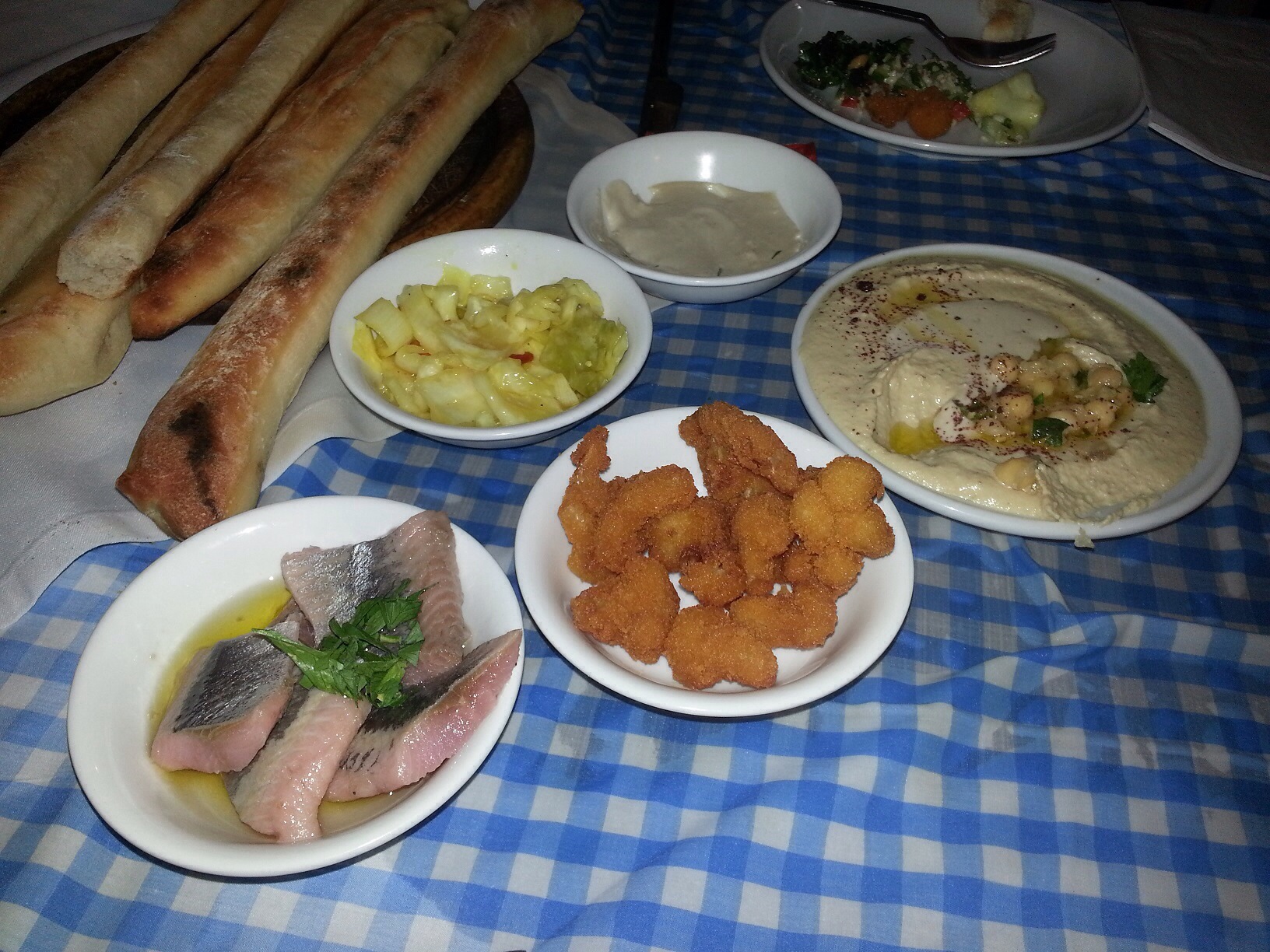 בתחילה פינקו אותנו בלחם טוסט מדהים וקראנצ׳י מלווה בפלטה שעליה צלוחיות עם סלטים טעימים, סלט טונה טרי, סלט אסייתי טעים במיוחד, זיתים משגעים ומתבל פיקנטי ערב לחך.