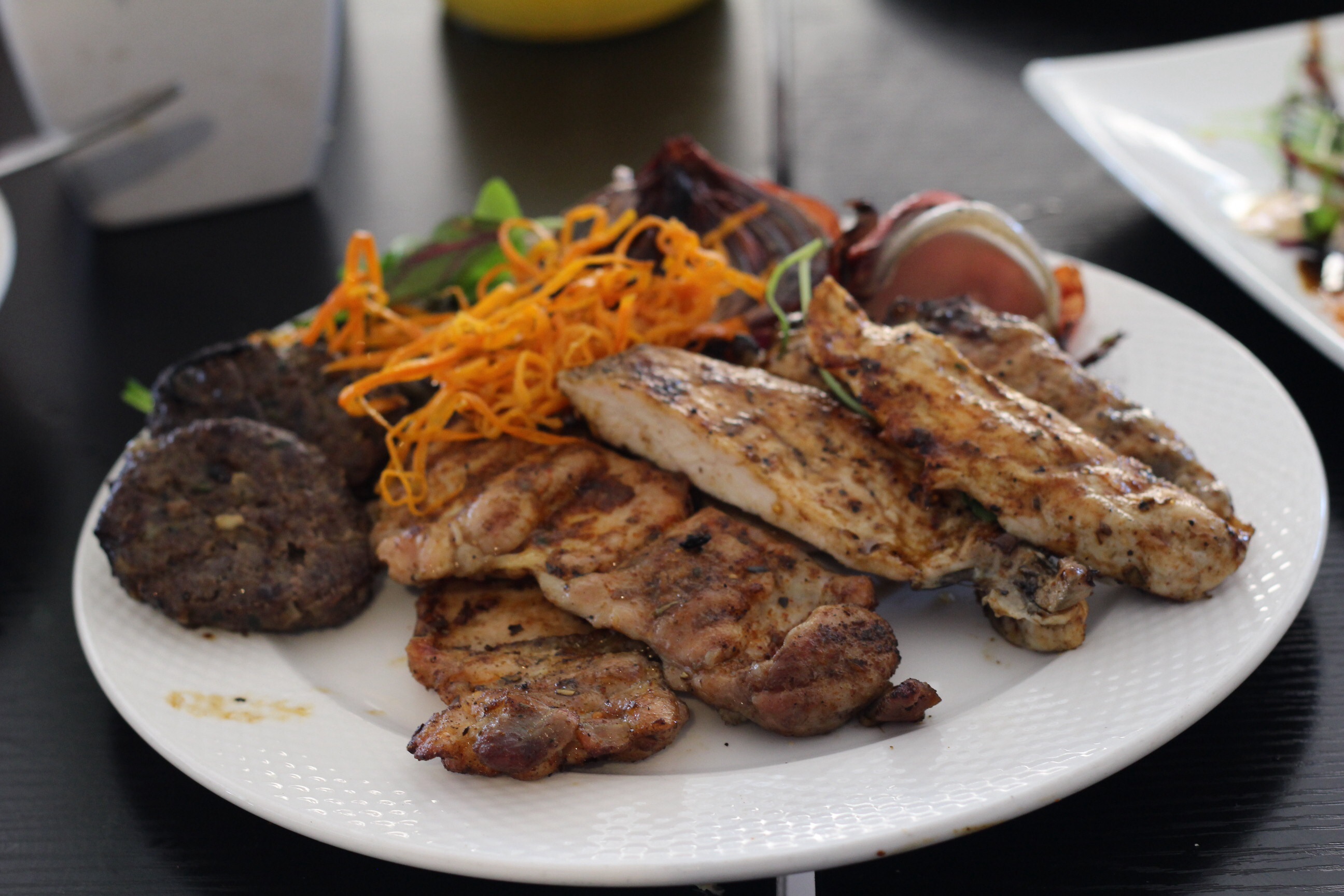 הזמנו מנה נוספת של פילה דג סלמון צרוב בגריל ברוטב חרדל, דבש וטריאקי מתקתק מוגש לצד צ׳יפס חם טעים וקראנצ׳י מוגש עם סלט ירוק. חובה לציין שהסלמון המדהים צרוב במידת עשיה נכונה רך ונימוך בפה טעמו של הרוטב המתקתק טעים להפליא ומשרה לדג צבע שזוף ומזמין.