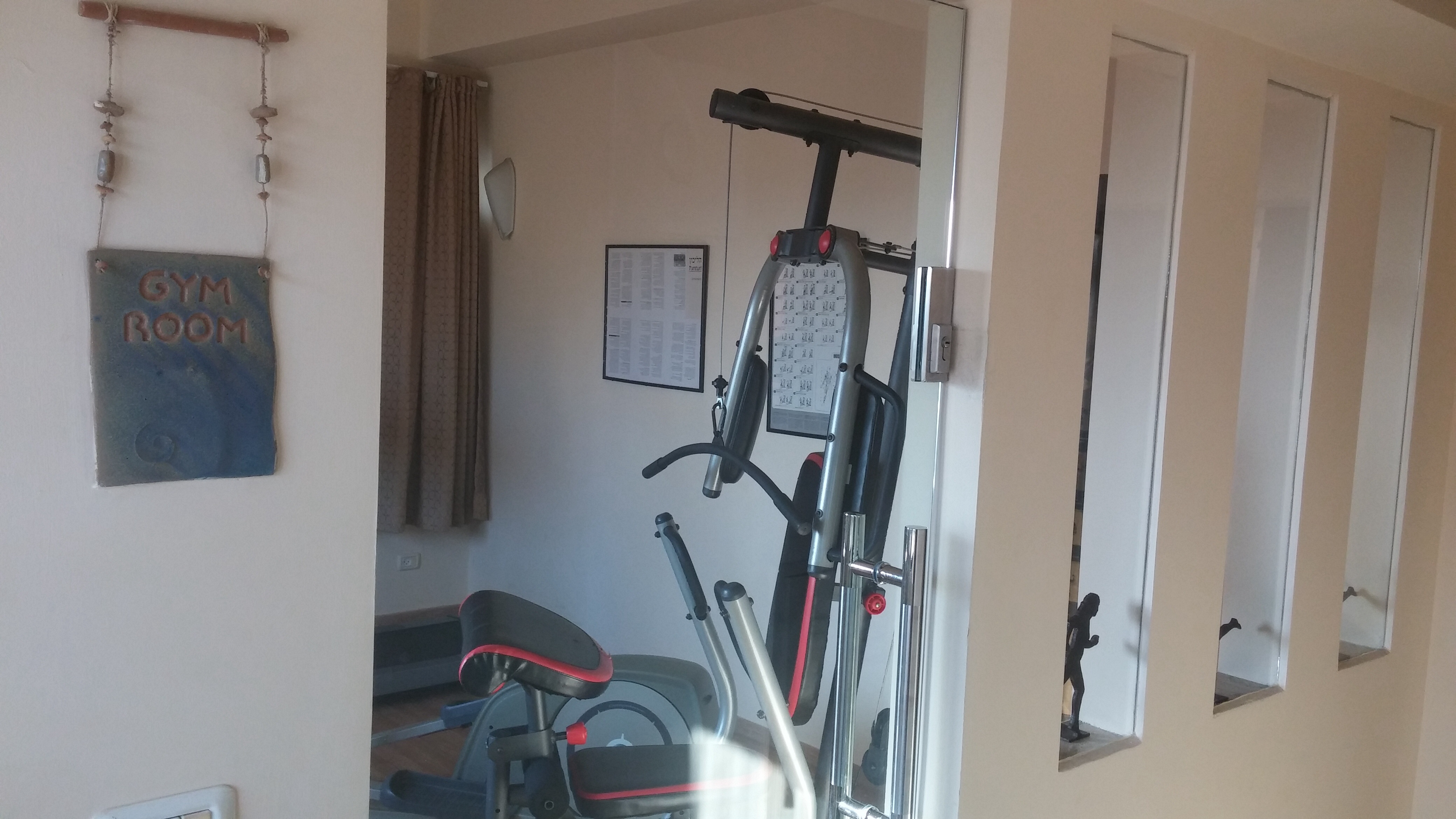 מלון ארט גלרי מציע מרפסת ענקית בקומה 5 צמוד לחדר כושר עם פינות ישיבה  שחפצי האמנות והפסלים נראים בכל פינה.