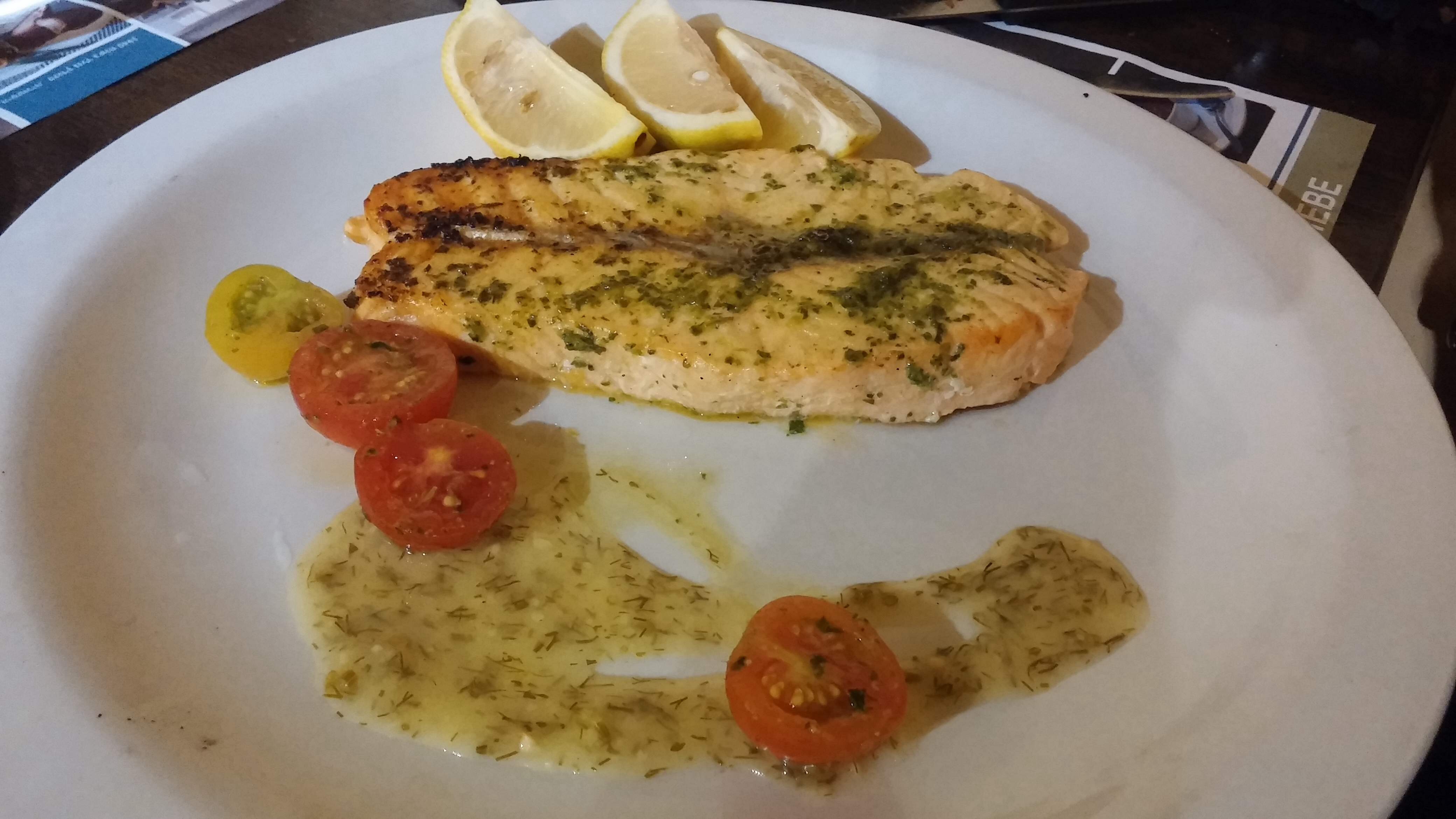 כמובן שלא ויתרנו על מנת השניצל עם סלט הכרוב אכן מנה גדולה ומשביעה למנות העקריות הזמנו פילה דג סלמון אפוי בתנור במידת עשיה נכונה שהוא נימוך בפה טעים ועסיסי.